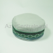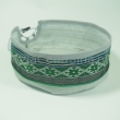 Letnia cienka męska czapka bez daszka - Krymka (fez, mycka, tubeteika, topu, takyja, tiubietejka, jarmułka) klasyczna lniana jasnoszara z wielokolorowa ozdobną czarno i zieloną wstążką w stylu boho i etnicznym. Rozmiar regulowany: 56-60cm.