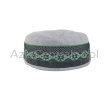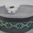 Letnia cienka męska czapka bez daszka - Krymka (fez, mycka, tubeteika, topu, takyja, tiubietejka, jarmułka) klasyczna lniana jasnoszara z ozdobną czarno i zieloną wstążką w stylu boho i etnicznym. Rozmiar regulowany: 56-61cm.