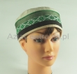 Letnia cienka męska czapka bez daszka - Krymka (fez, mycka, tubeteika, topu, takyja, tiubietejka, jarmułka) klasyczna beżowa lniana ze zieloną wstążką w stylu boho i etnicznym. Rozmiar regulowany: 56-61cm.