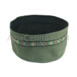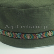 Klasyczna męska krymka (mycka, tubeteika, takyja, tiubietejka, jarmułka) męska czapka ubraniowa w zielone khaki z kolorową dekoracyjną tasiemką.