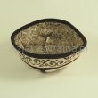 Krymka uszyta z czterech kawałków filcowanej wełny merynosów i wykończona czarnym kolorze. Czapka posiada haft koczowników. Cała zfilcowana powierzchnia jest pikowana.