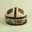 Krymka uszyta z czterech kawałków filcowanej wełny merynosów i wykończona czarnym kolorze. Czapka posiada haft koczowników. Cała zfilcowana powierzchnia jest pikowana.