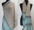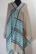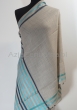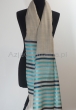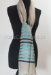 Bardzo elegancki dwustronny duży szal z wełny merynosów, połączony z jedwabiem. Beżowy podstawowy kolor szalu doskonale współgra z turkusowymi i  zielonymi paskami.  Włókna jedwabne nadają delikatności i lekkości o naturalnym połysku. Wełna daje przyjemne odczucie ciepła. Nowoczesny dizajn powoduje, iż przeznaczony tak dla Pań jak i dla Panów. Doskonale nada się na ciepłe i zimniejsze jesienne-zimowe dni.