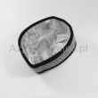 Krymka uszyta z czterech kawałków w jasno szarym kolorze i wykończona czarnym sztruksem lub aksamitem.